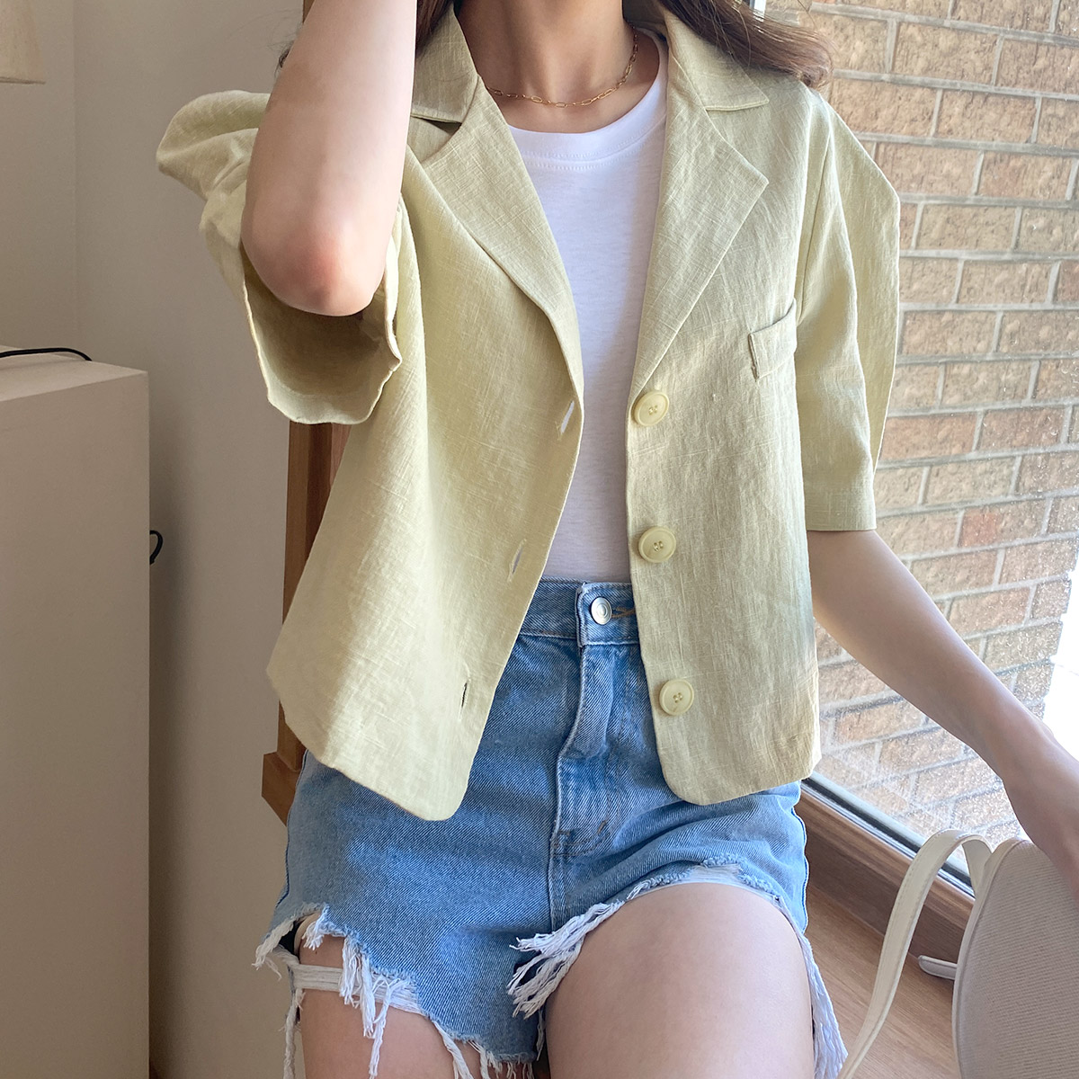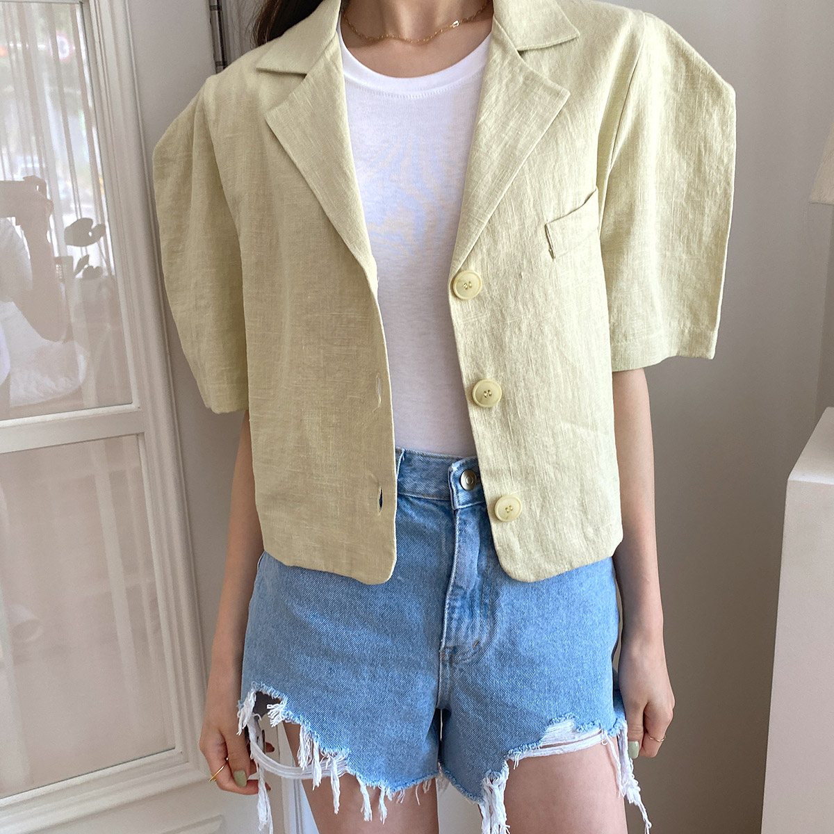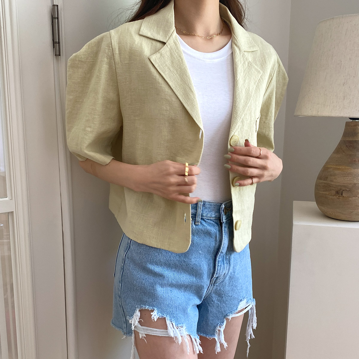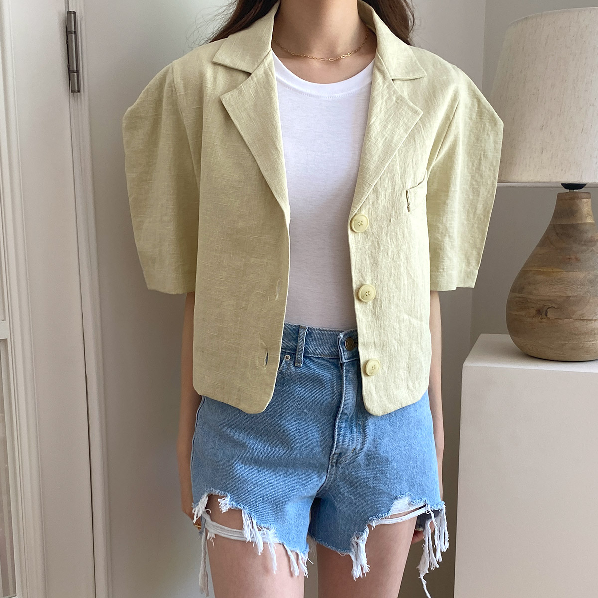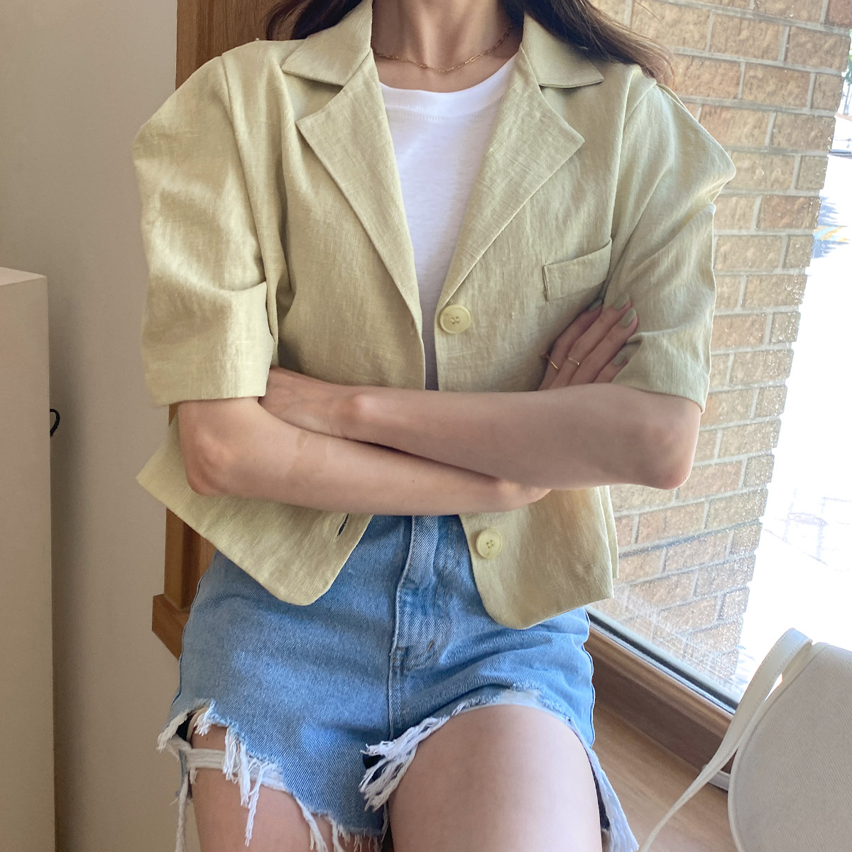 여자 크롭 린넨 퍼프 숏 싱글 자켓 봄 여름 아이보리 퍼플 소라 라임 반팔