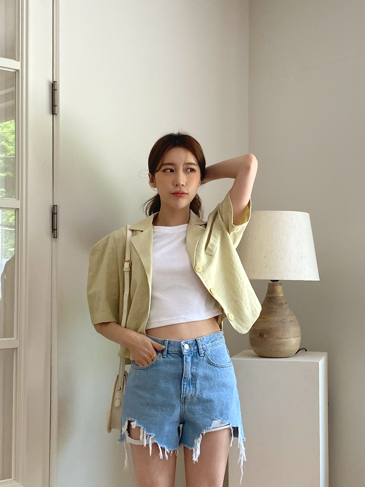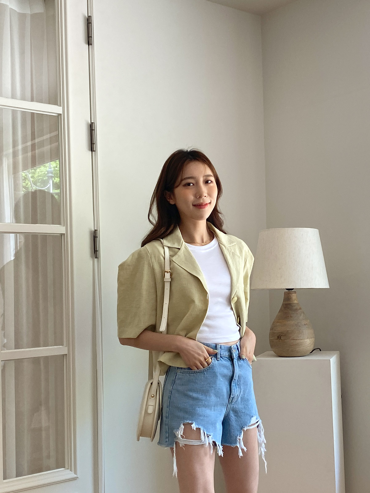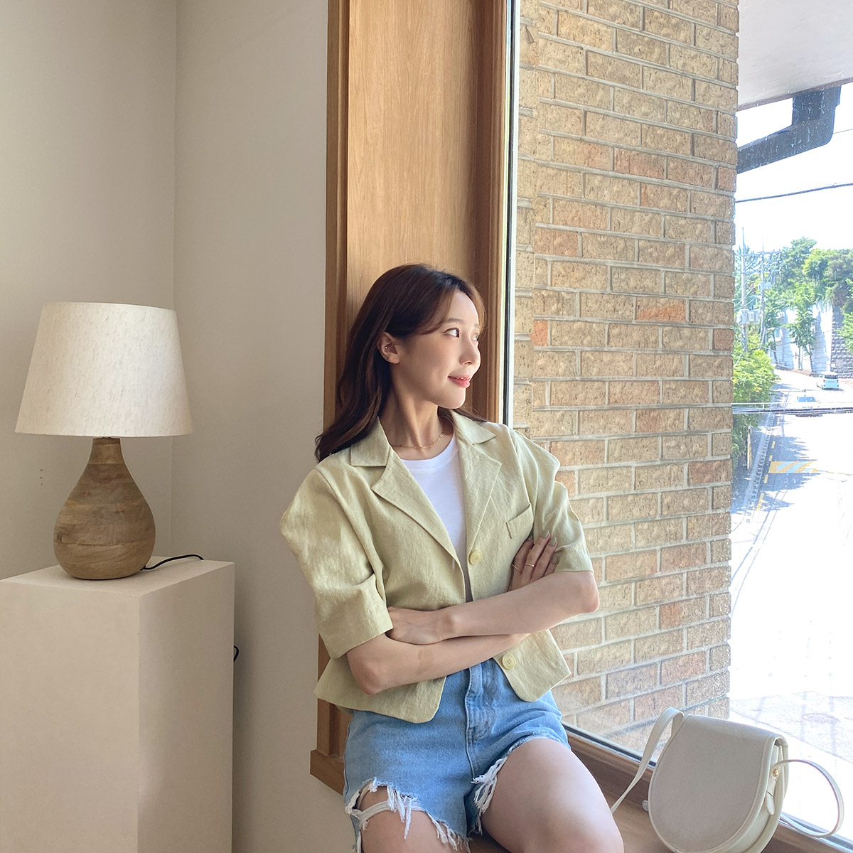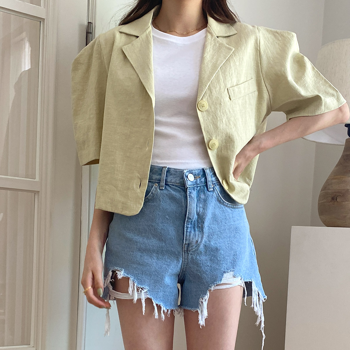 여자 크롭 린넨 퍼프 숏 싱글 자켓 봄 여름 아이보리 퍼플 소라 라임 반팔