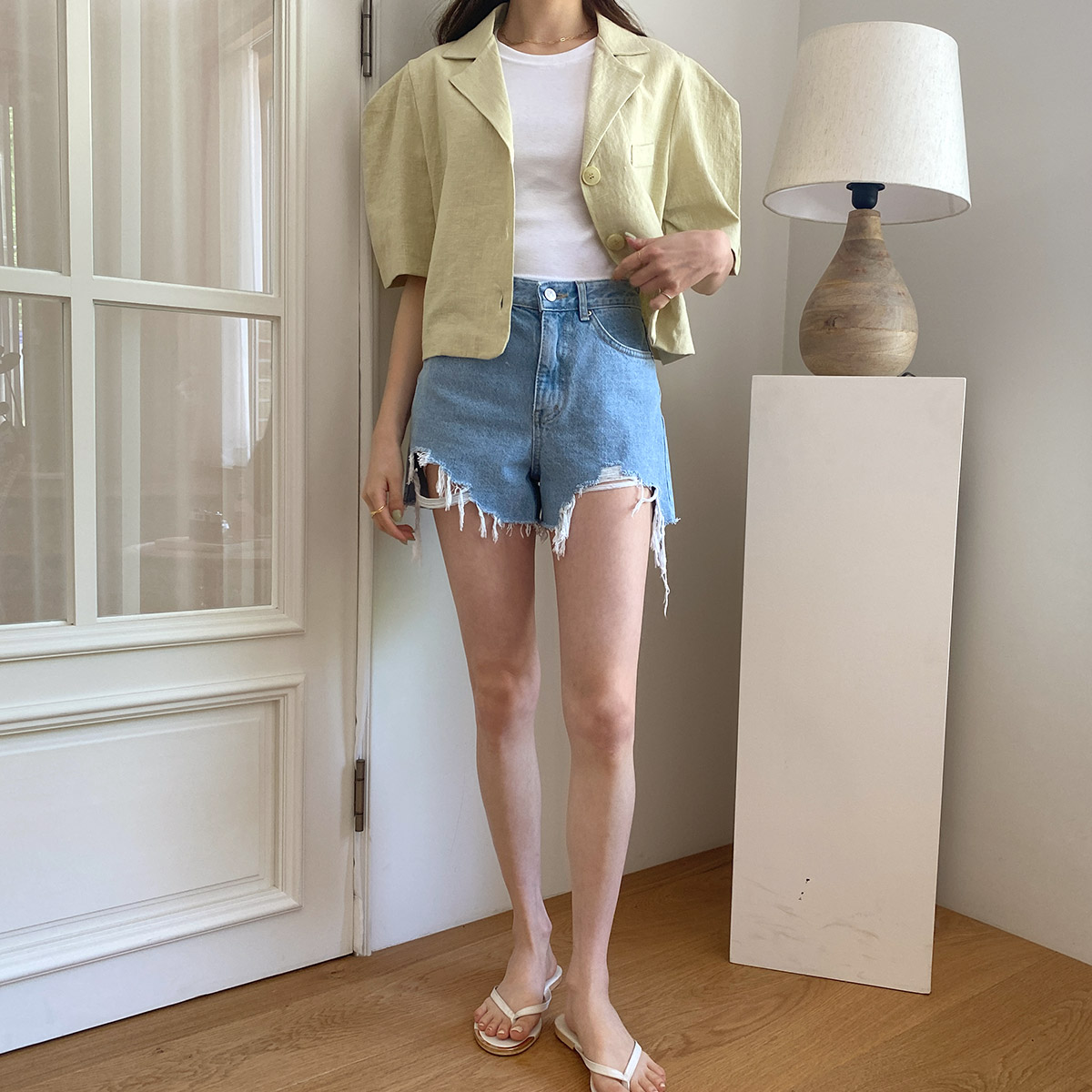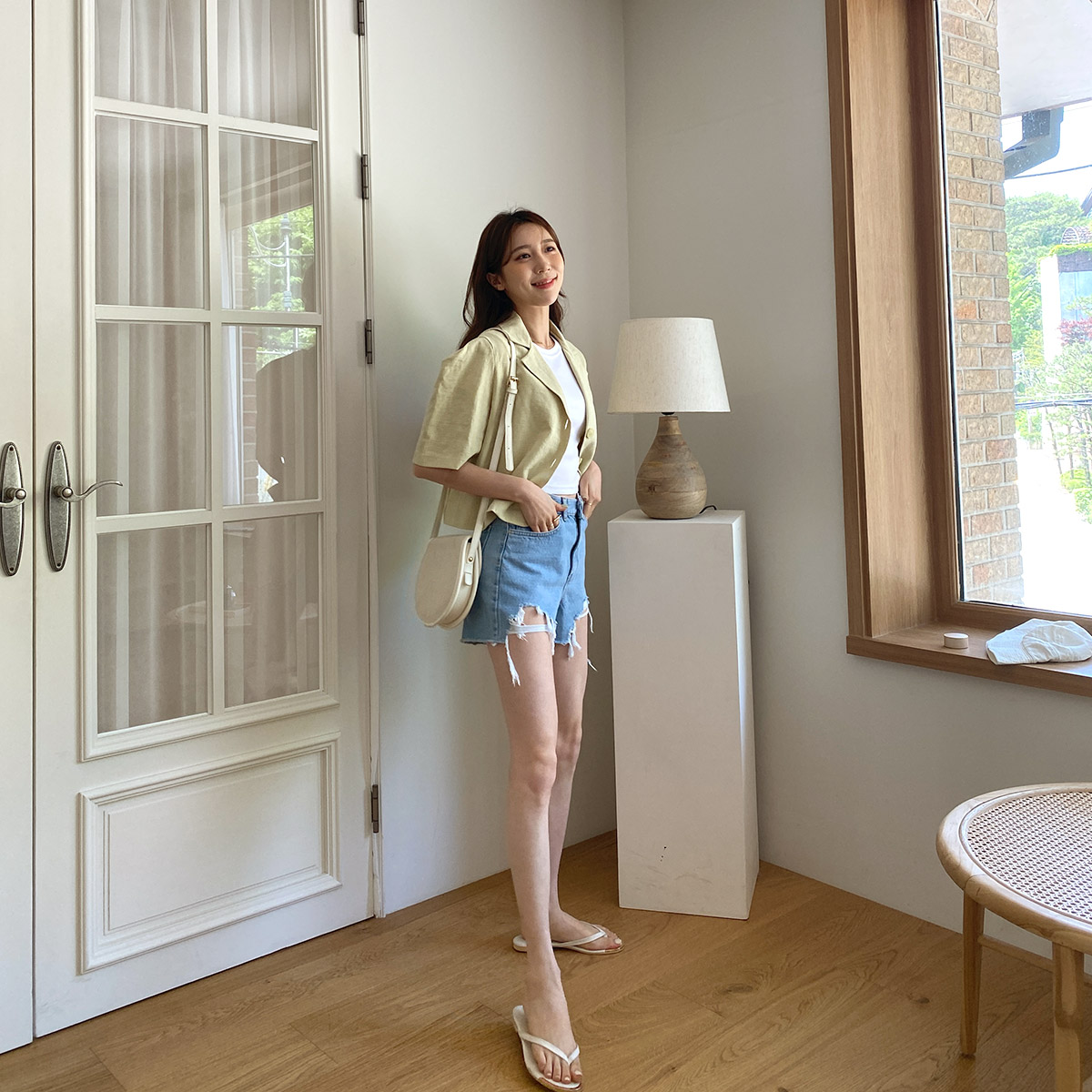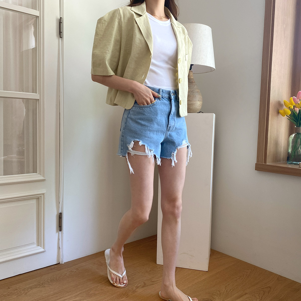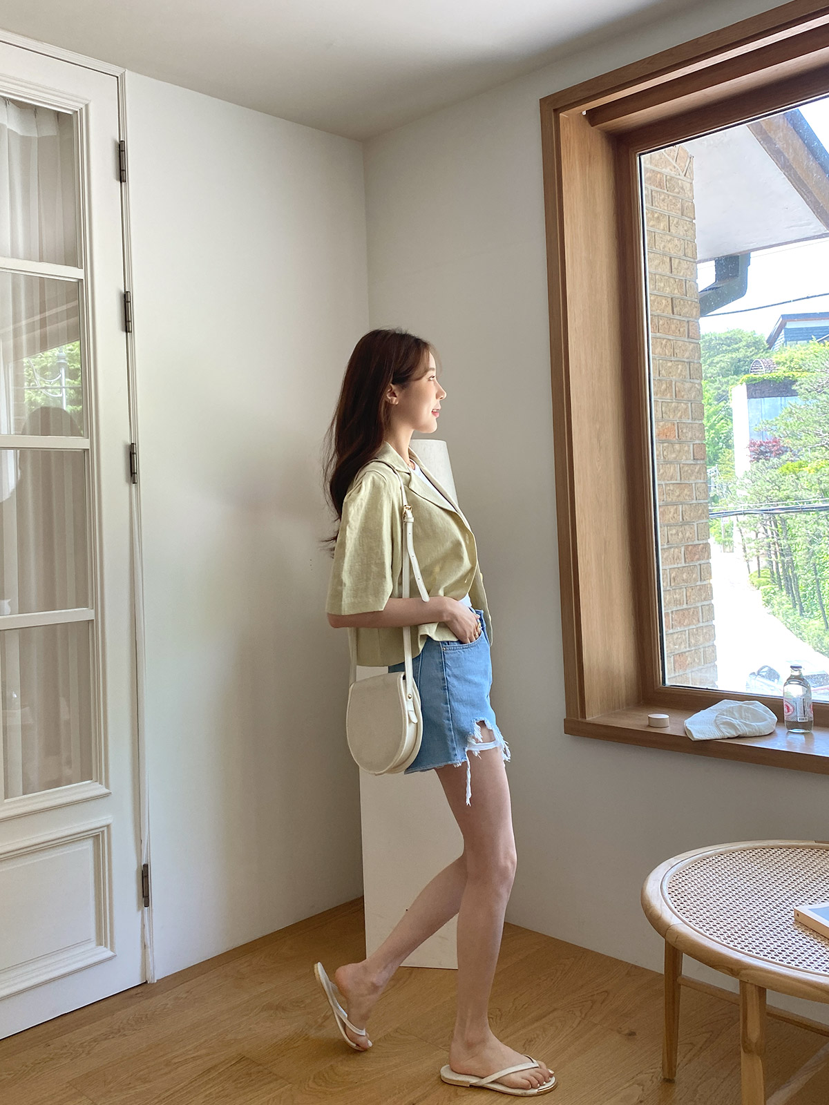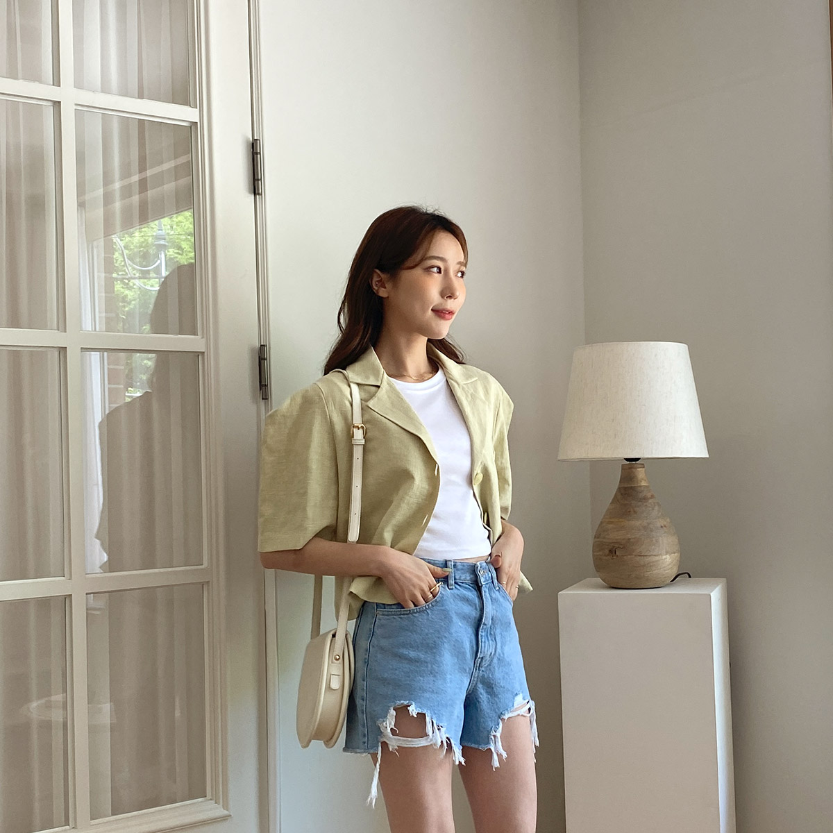 여자 크롭 린넨 퍼프 숏 싱글 자켓 봄 여름 아이보리 퍼플 소라 라임 반팔