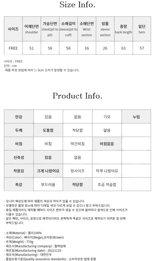 베이지, 브라운 / FREE 사이즈 착용했습니다^^