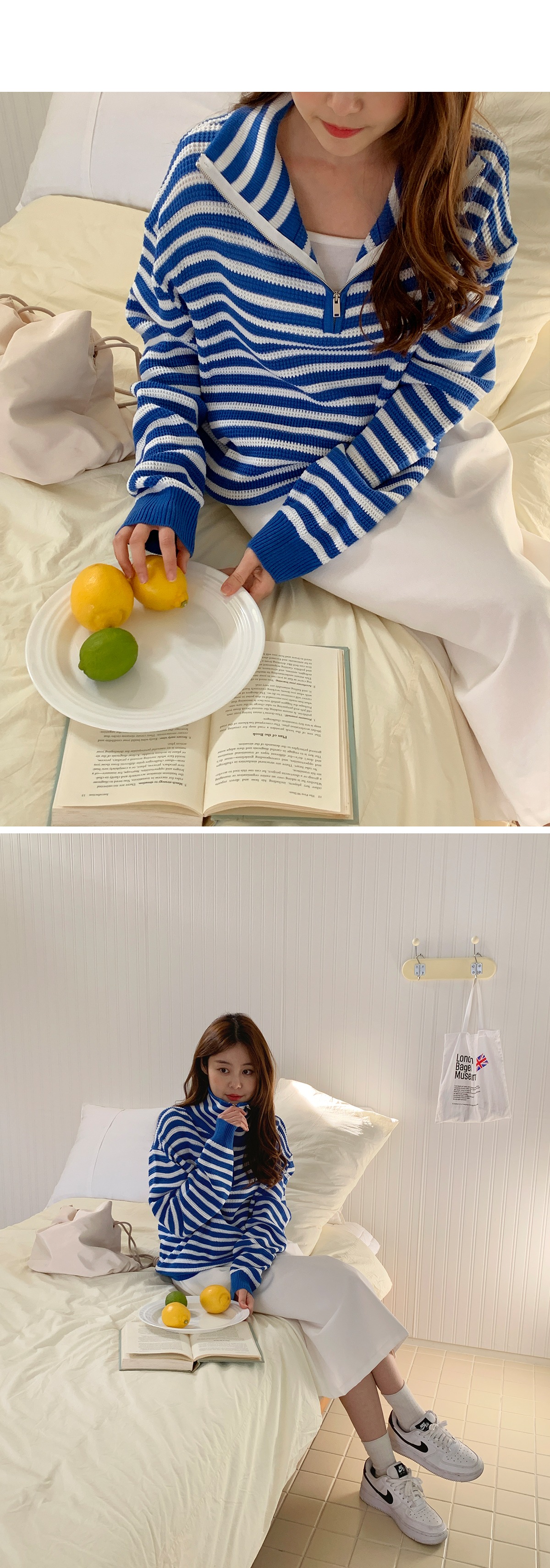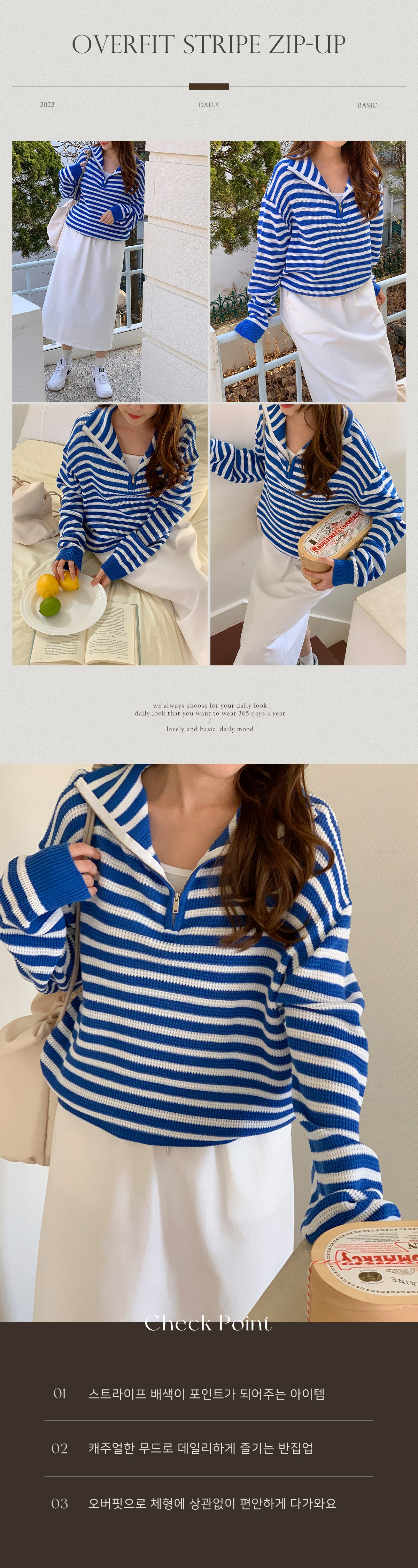 오버핏 스트라이프 단가라 반집업 니트 티셔츠