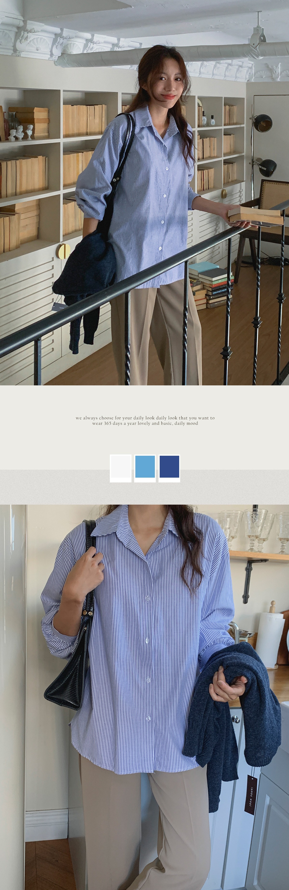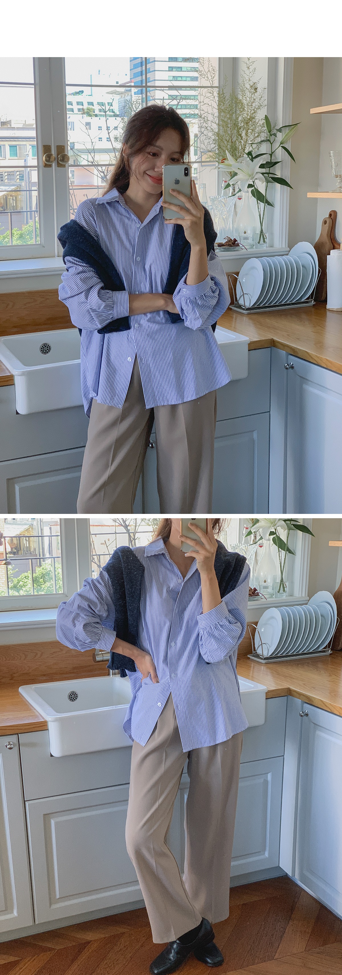 스트라이프셔츠 소매 셔링 포인트 카라 줄무늬 셔츠