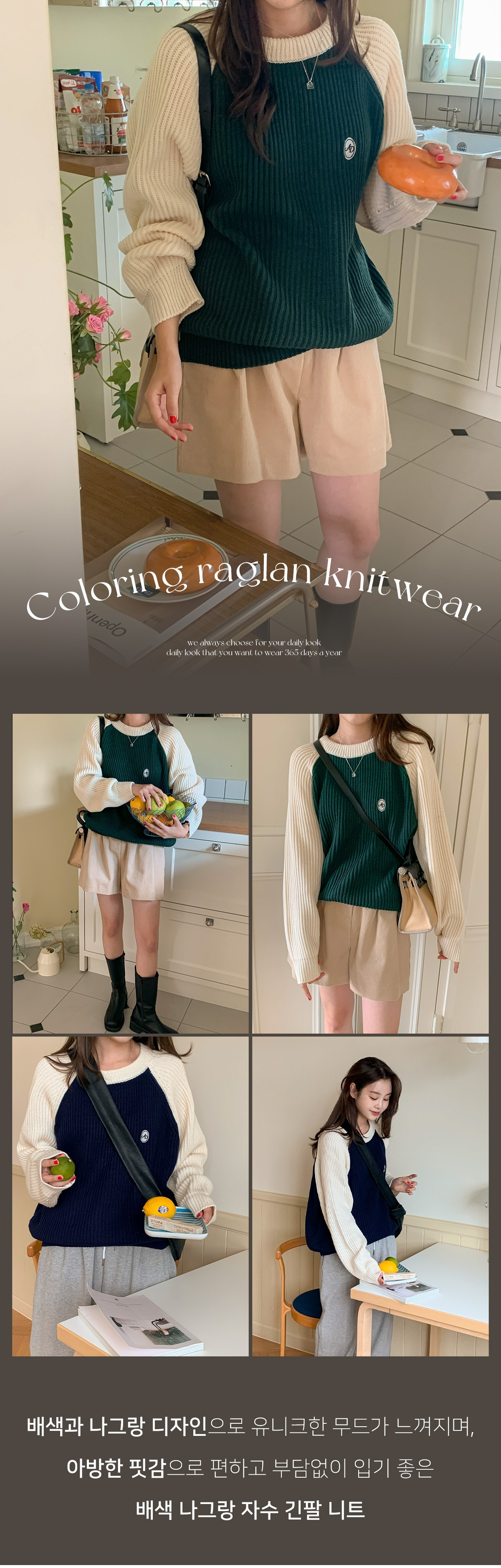 여성 라운드 나그랑 배색 자수 가을 긴팔 니트 티셔츠