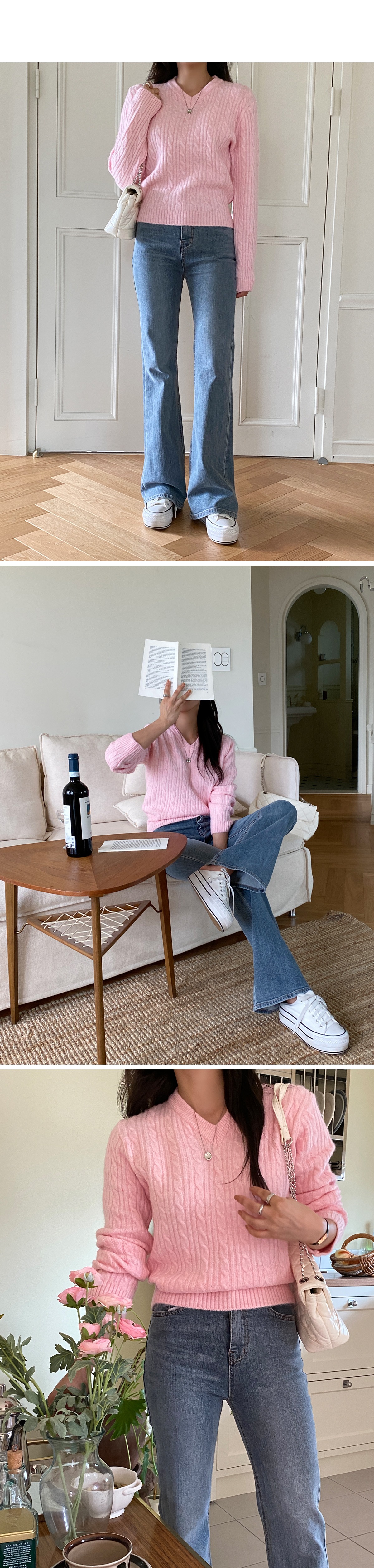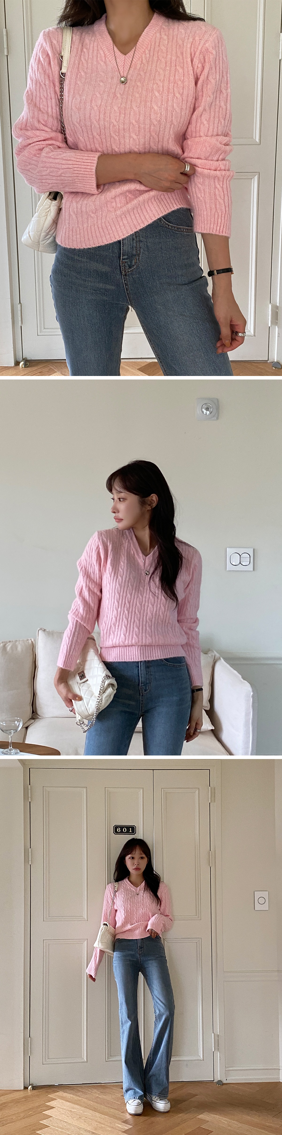 케이블니트 꽈배기니트 파스텔 브이넥 긴팔 여성 니트티