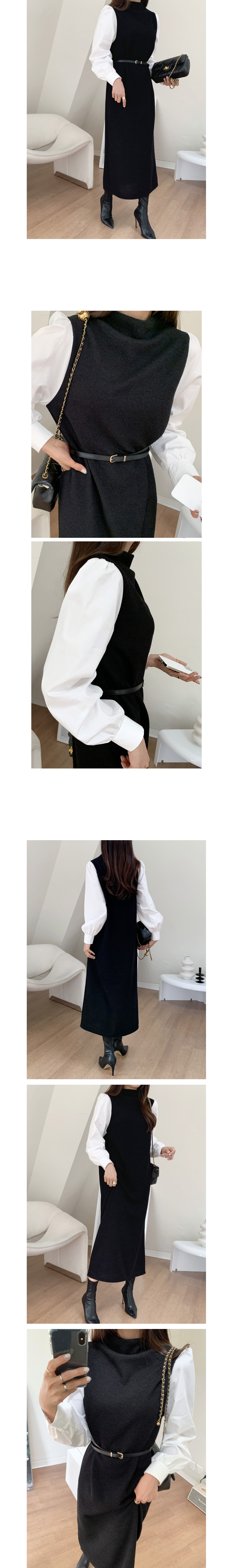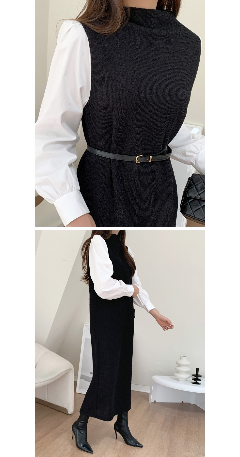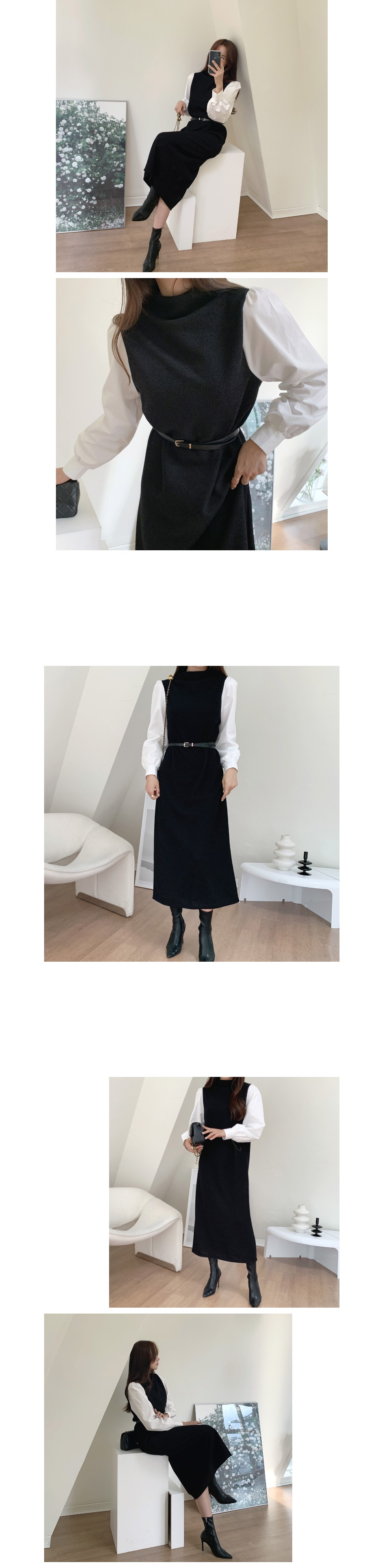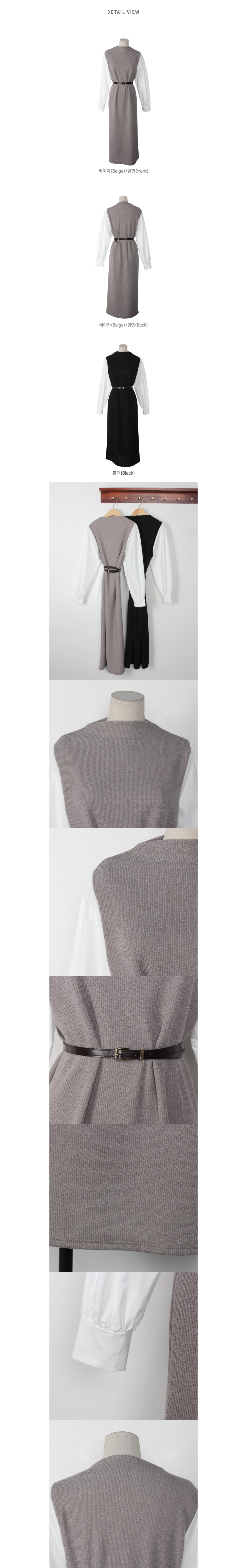 벨트 스트랩 프릴 셔츠 니트 롱 원피스 베이지 블랙 긴팔 러블리 가을