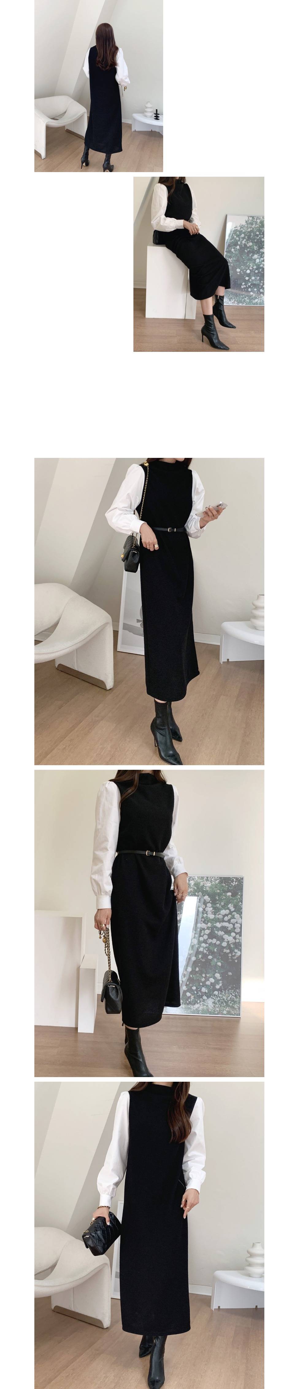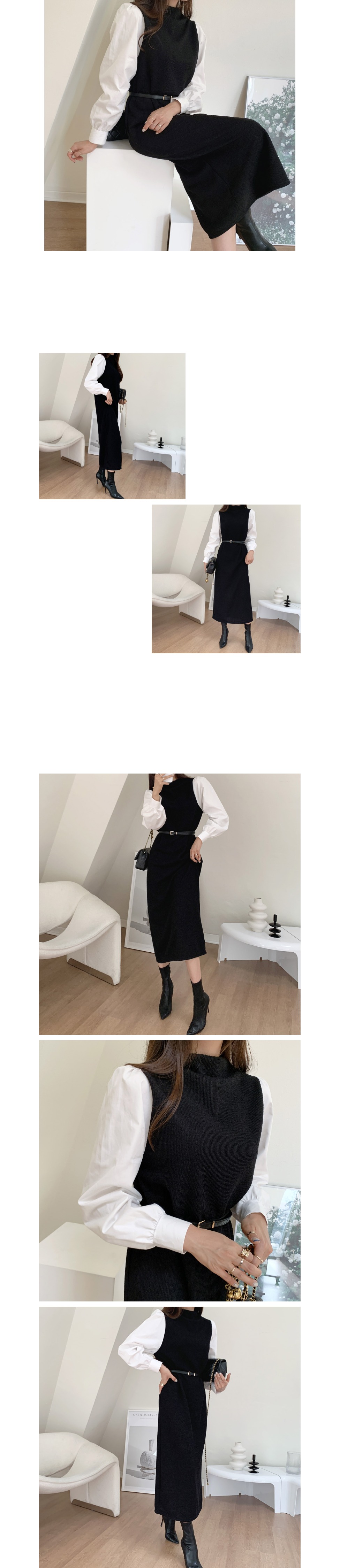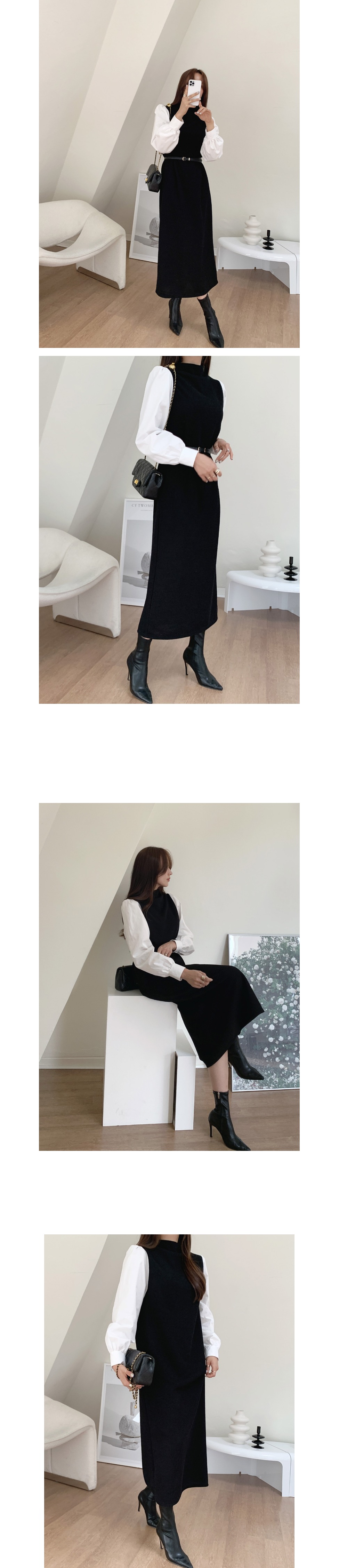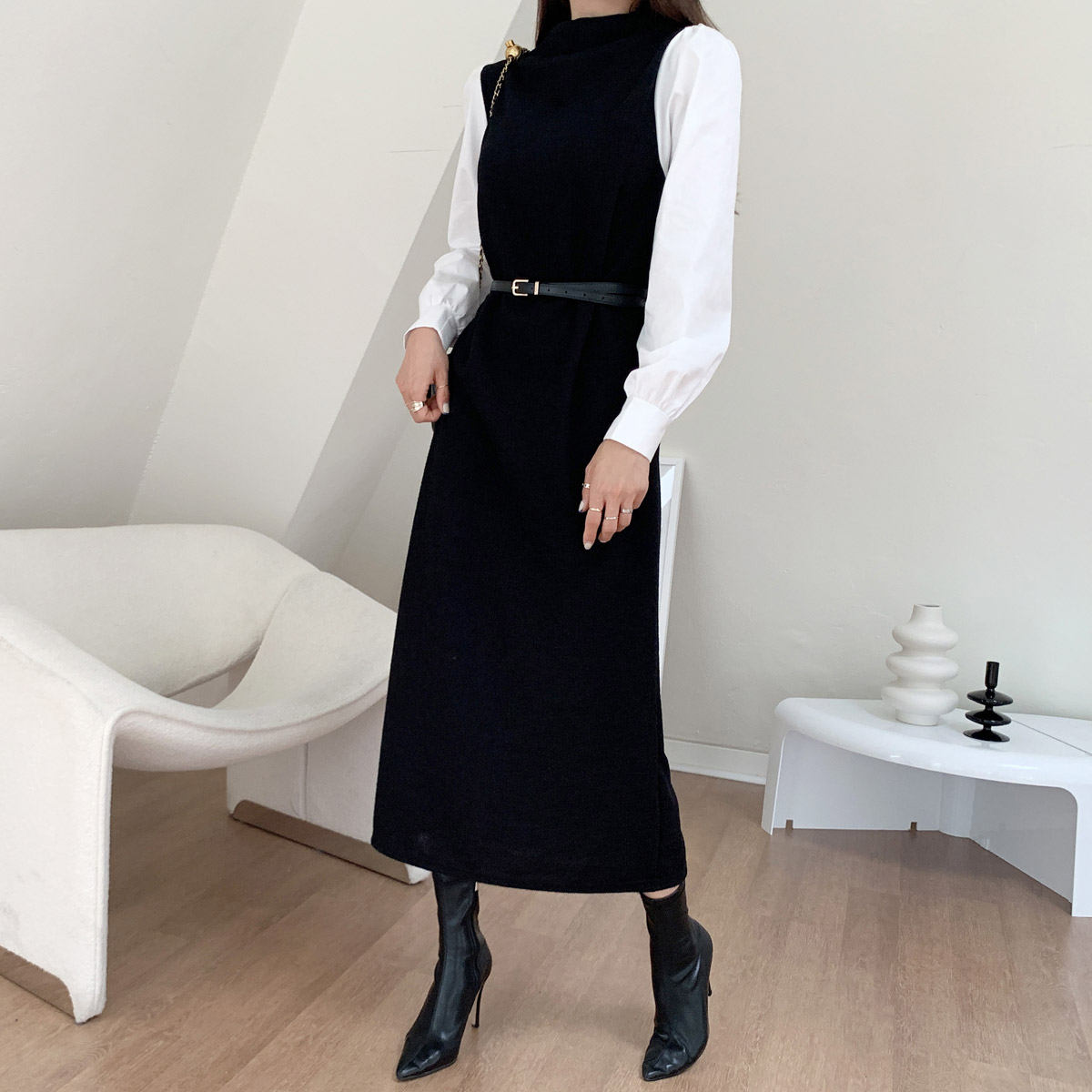 벨트 스트랩 프릴 셔츠 니트 롱 원피스 베이지 블랙 긴팔 러블리 가을