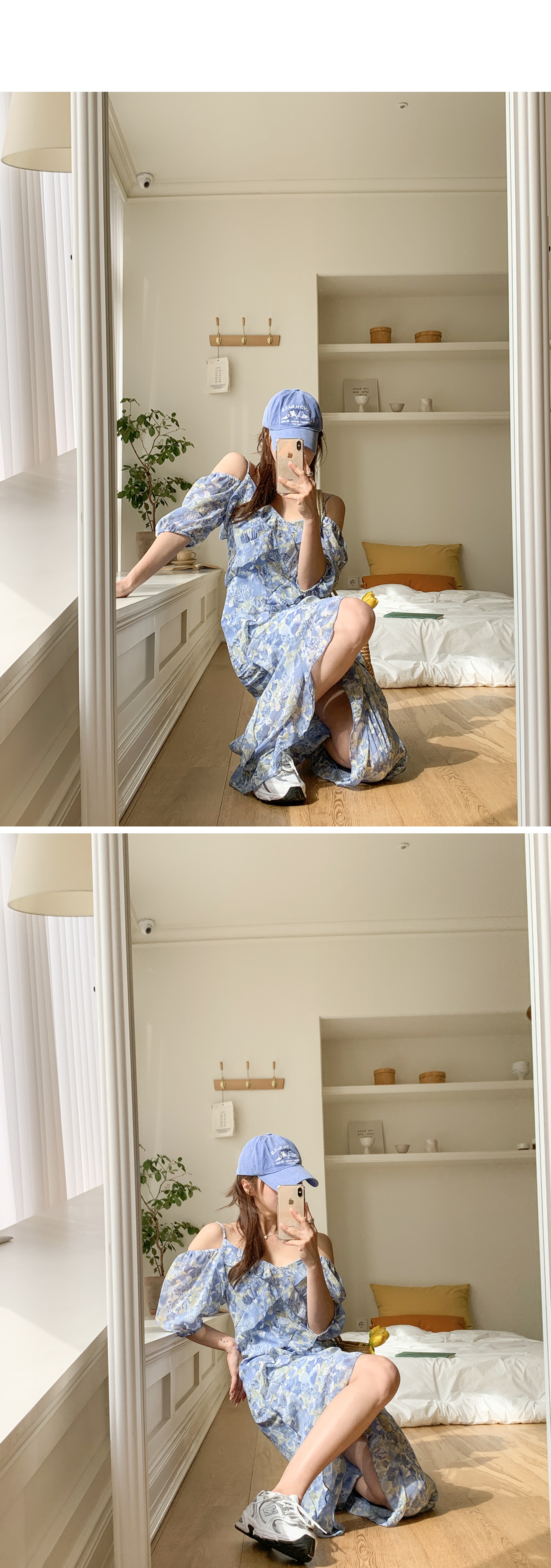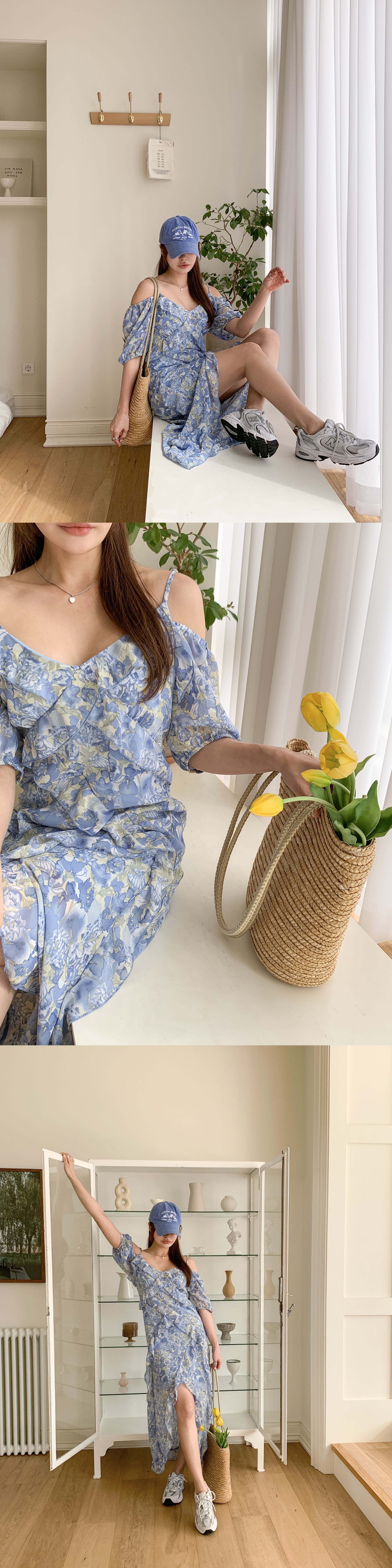 플라워 패턴 셔링 오프숄더 끈나시 원피스입니다