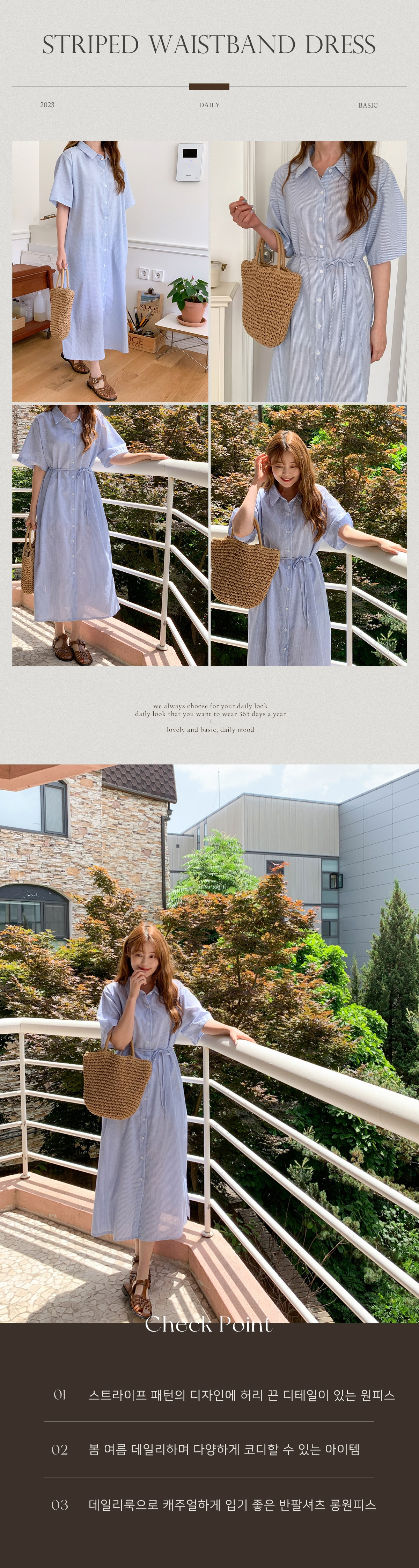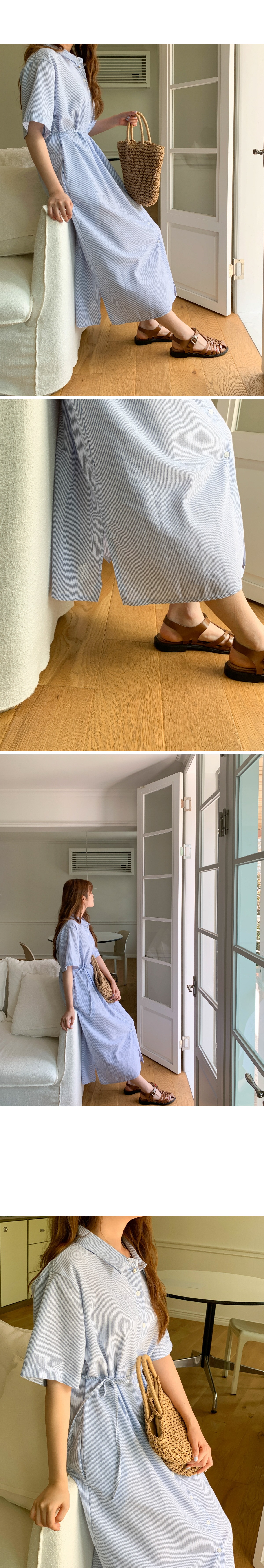 스트라이프원피스 카라 셔츠 허리끈 캐주얼 반팔 롱 원피스