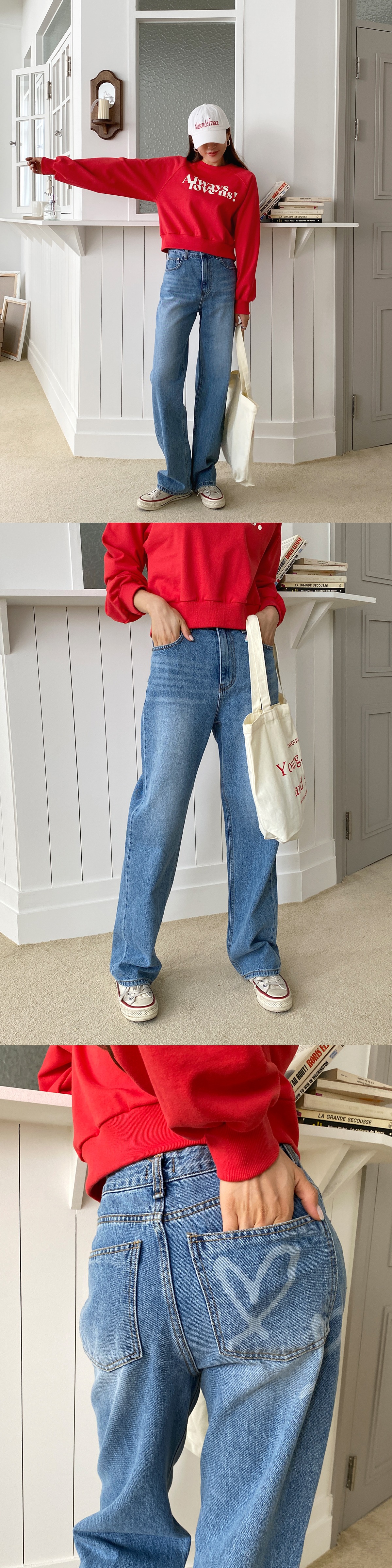 와이드청바지 하트 코튼 워싱 데님 여성 통큰바지 팬츠