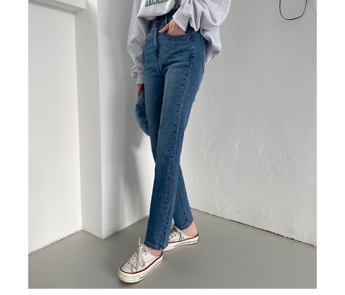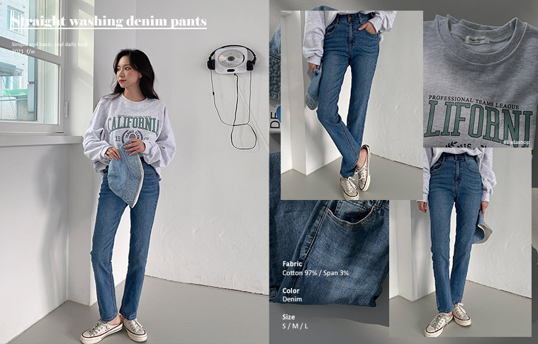 캐주얼한 룩으로 입기 좋은 일자 워싱 데님 팬츠입니다.