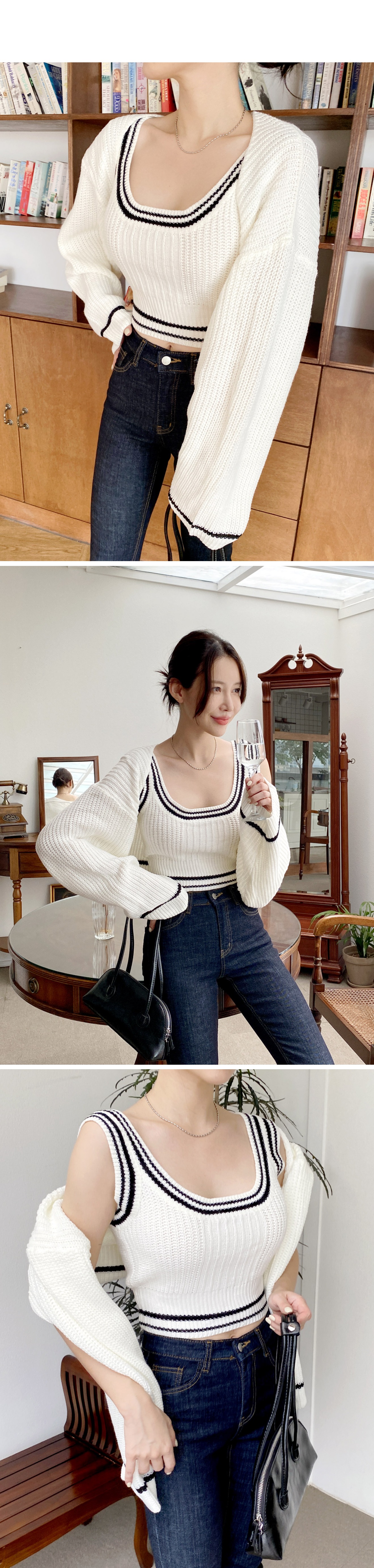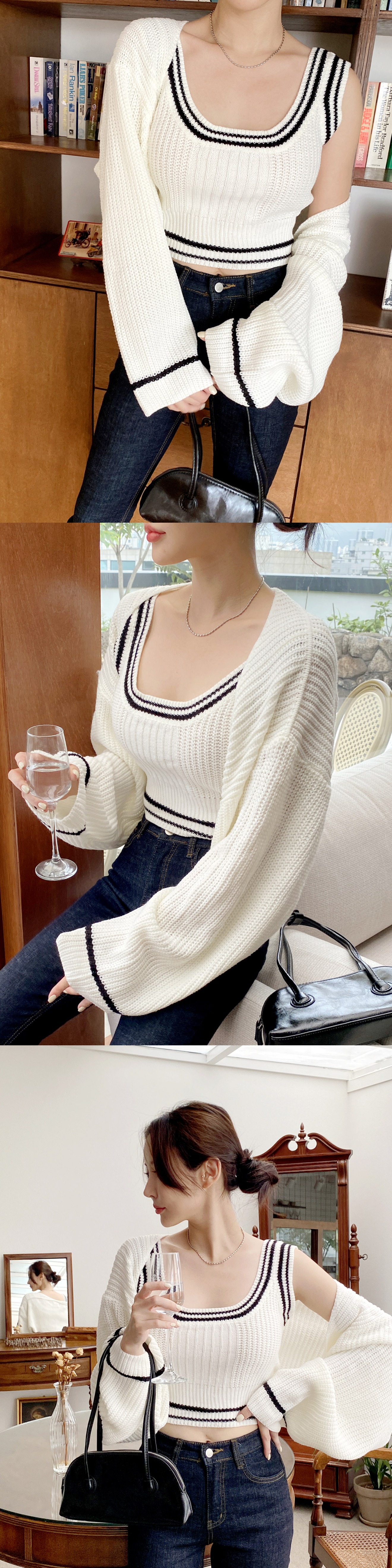 배색 니트 나시 볼레로 가디건 코디 세트