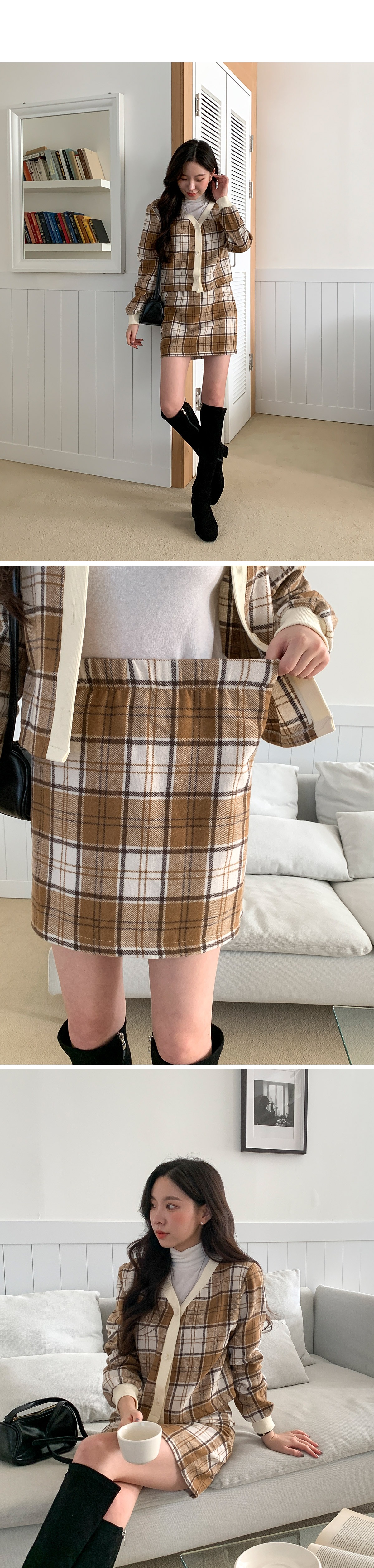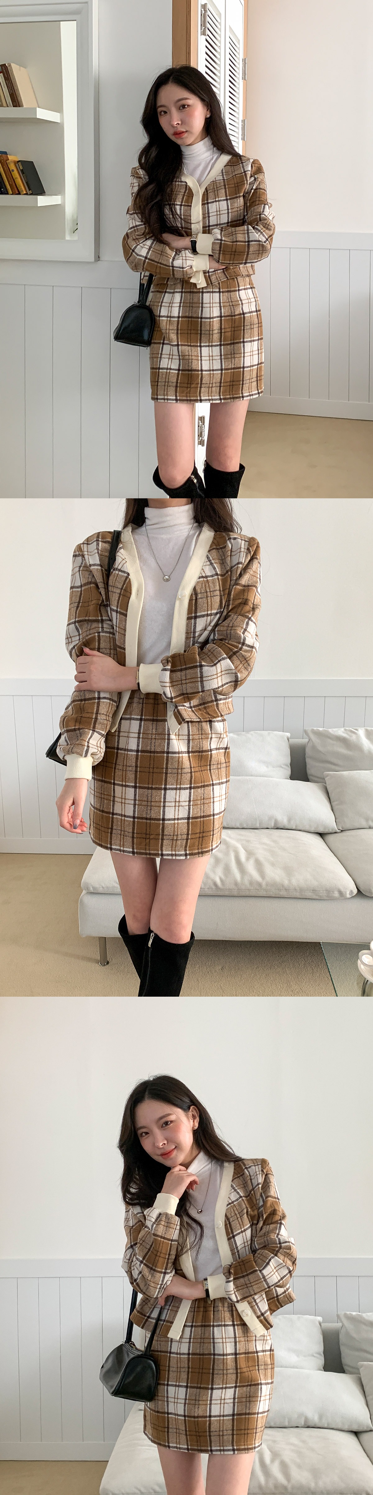 브이넥 체크 배색 크롭 가디건 밴딩 미니 스커트 세트