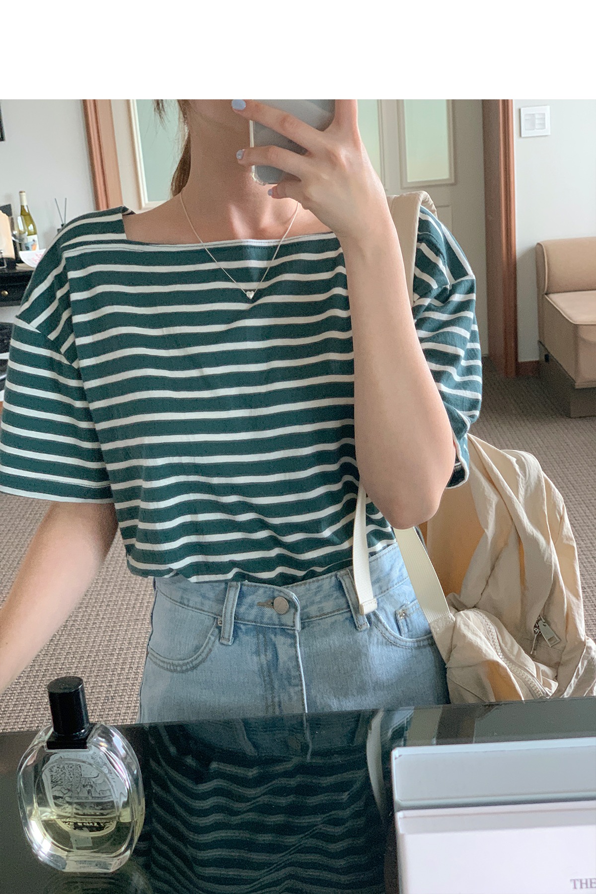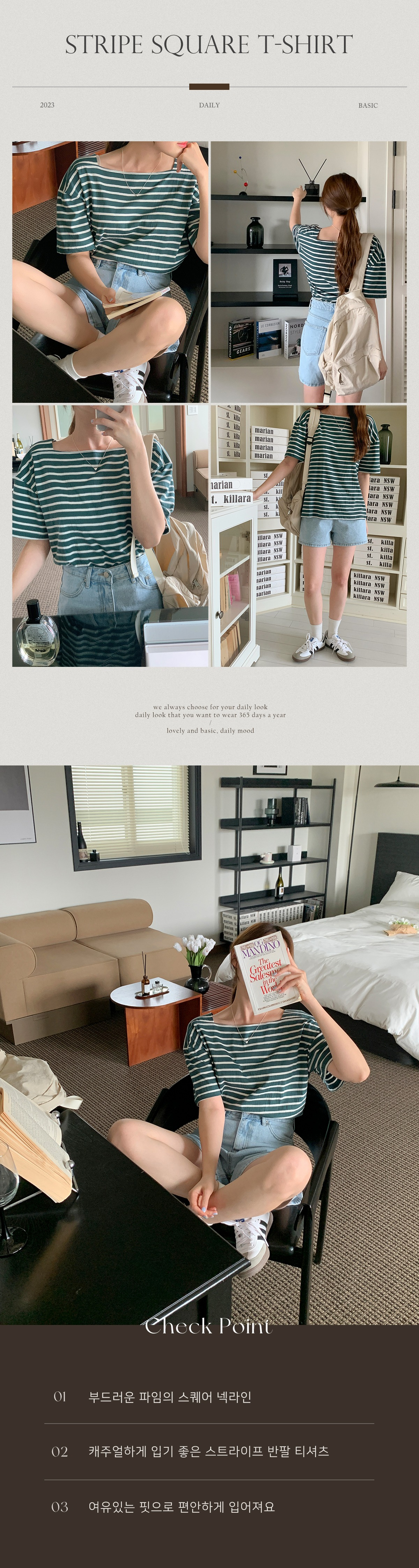 스퀘어넥티셔츠 스트라이프 오버핏 봄여름 여성 반팔 티셔츠