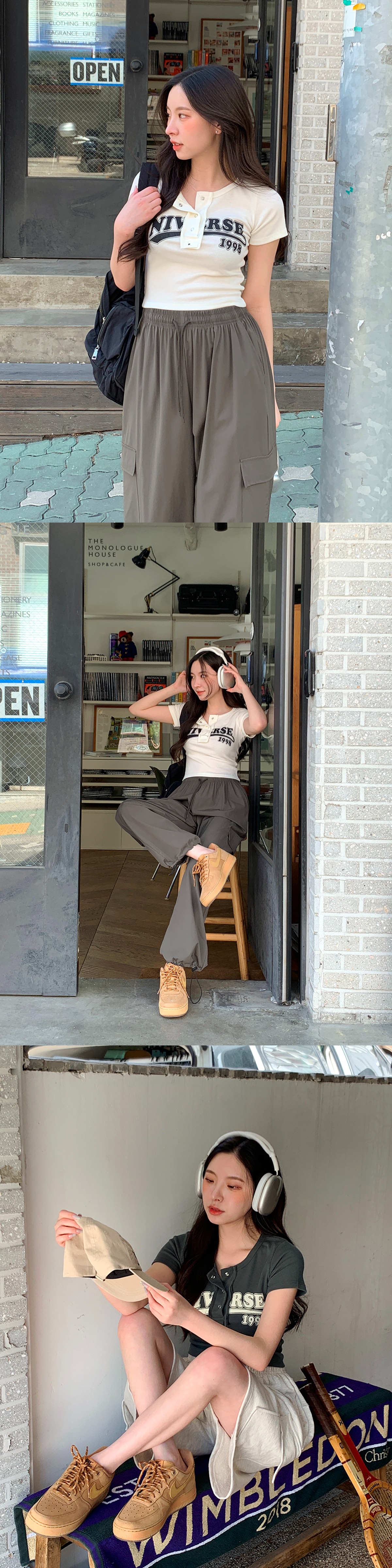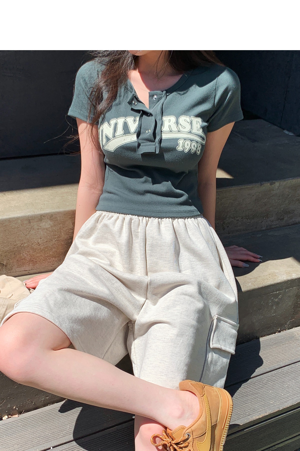 라운드넥 단추 또또 나염 크롭티 여성 여름 반팔 티셔츠