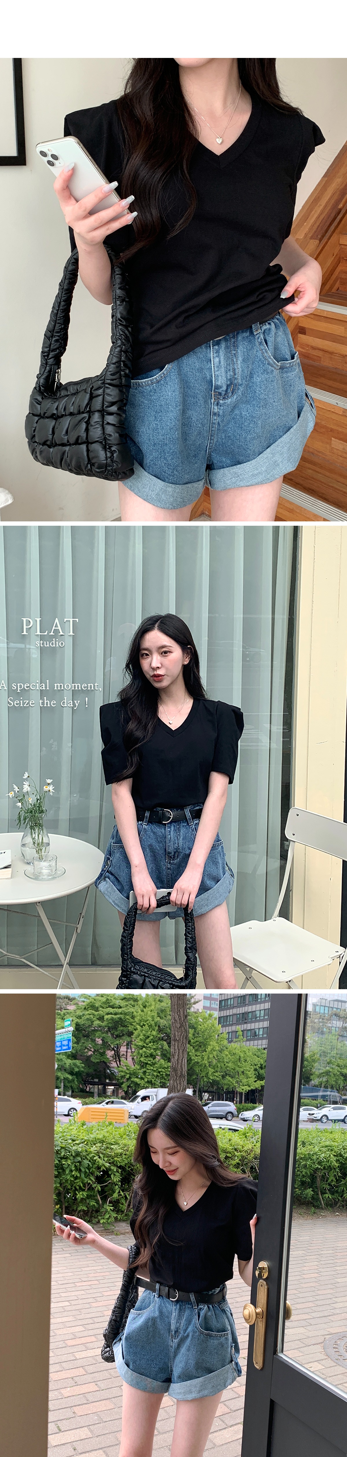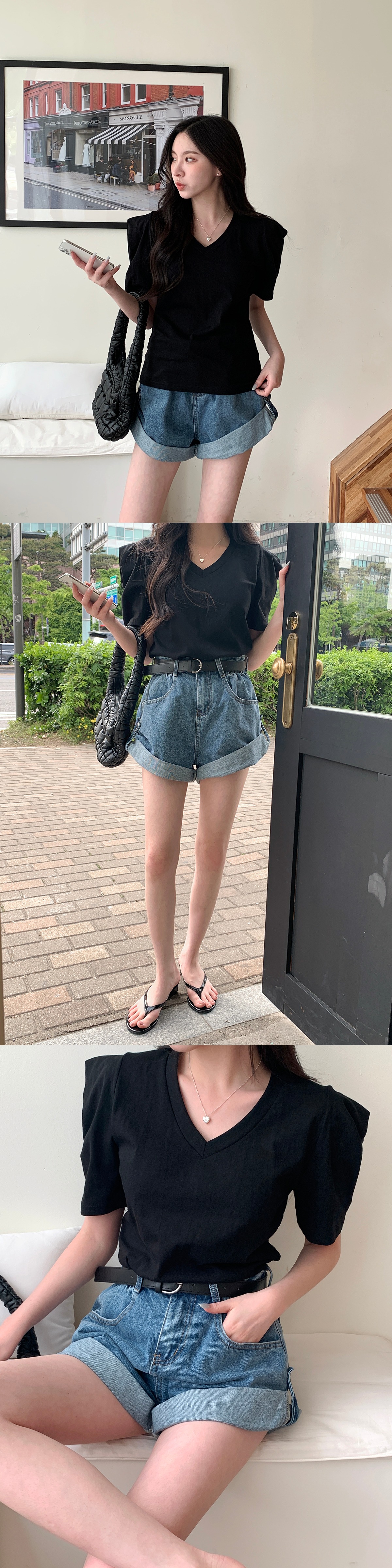 브이넥 어깨 퍼프 무지 반팔 티셔츠입니다