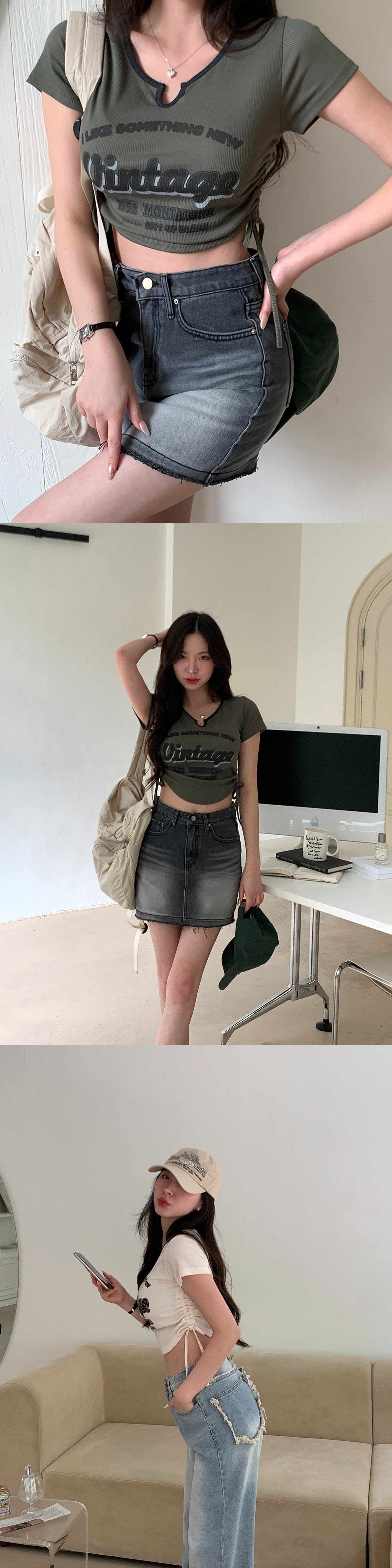 크롭티 라운드 트임 스트링 슬림핏 솔지 숏 반팔 티셔츠